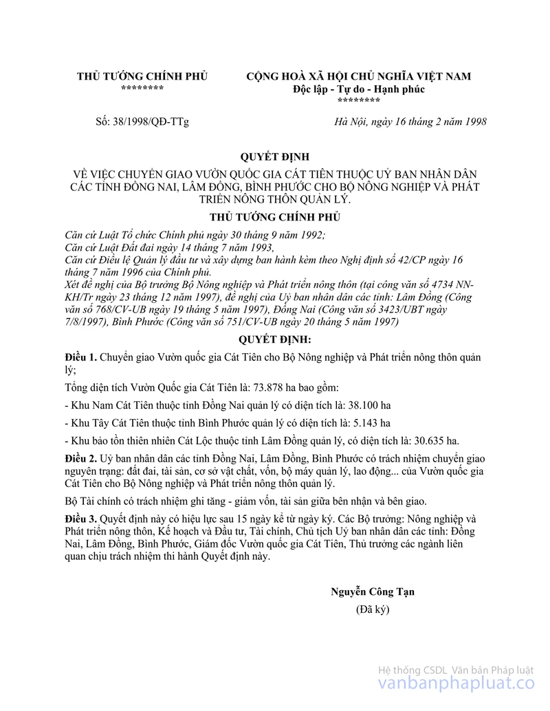 Điều 2.- Vườn quốc gia Cát Tiên được thành lập căn cứ vào Quyết định số 08/CT ngày 13/01/1992 của Chủ tịch Hội đồng Bộ trưởng (nay là Chính phủ) về việc thành lập và phê duyệt Luận chứng Kinh tế kỹ thuật VQG Cát Tiên; Quyết định số 38/1998/QĐ-TTg ngày 16/02/1998 của Thủ tướng Chính phủ về việc chuyển giao VQG Cát Tiên thuộc UBND các tỉnh Đồng Nai, Lâm Đồng, Bình Phước cho Bộ Nông nghiệp và Phát triển nông thôn; Quyết định số 117/1999/QĐ/BNN/TCCB ngày 14/8/1999 của Bộ Nông nghiệp và phát triển nông thôn về chức năng, nhiệm vụ và tổ chức bộ máy của Vườn quốc gia Cát Tiên.