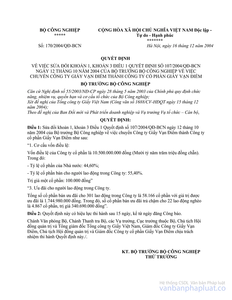 Nội dung toàn văn Quyết định 107/2004/QĐ-BCN chuyển Công ty Giấy Vạn Điểm thành Công ty cổ phần