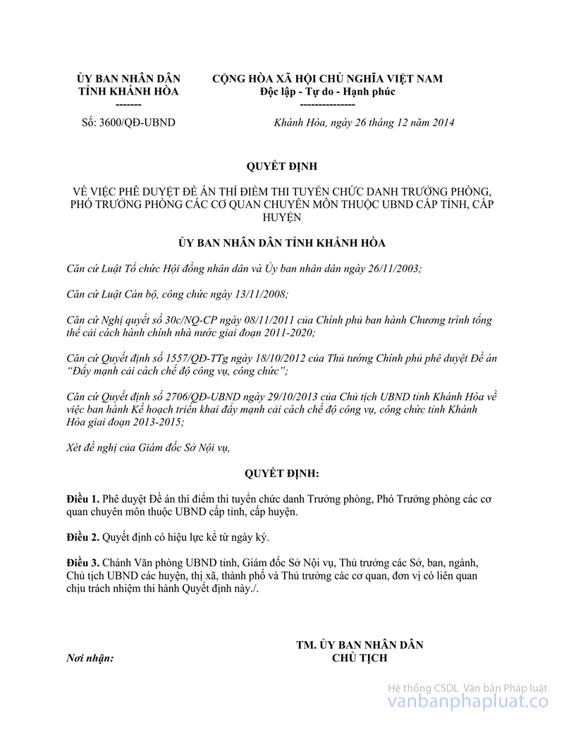Căn cứ Quyết định số 3600/QĐ-UBND ngày 26 tháng 12 năm 2014 của Ủy ban nhân dân tỉnh về việc phê duyệt Đề án thí điểm thi tuyển chức danh Trưởng phòng, Phó Trưởng phòng các cơ quan chuyên môn thuộc Ủy ban nhân dân cấp tỉnh, cấp huyện;