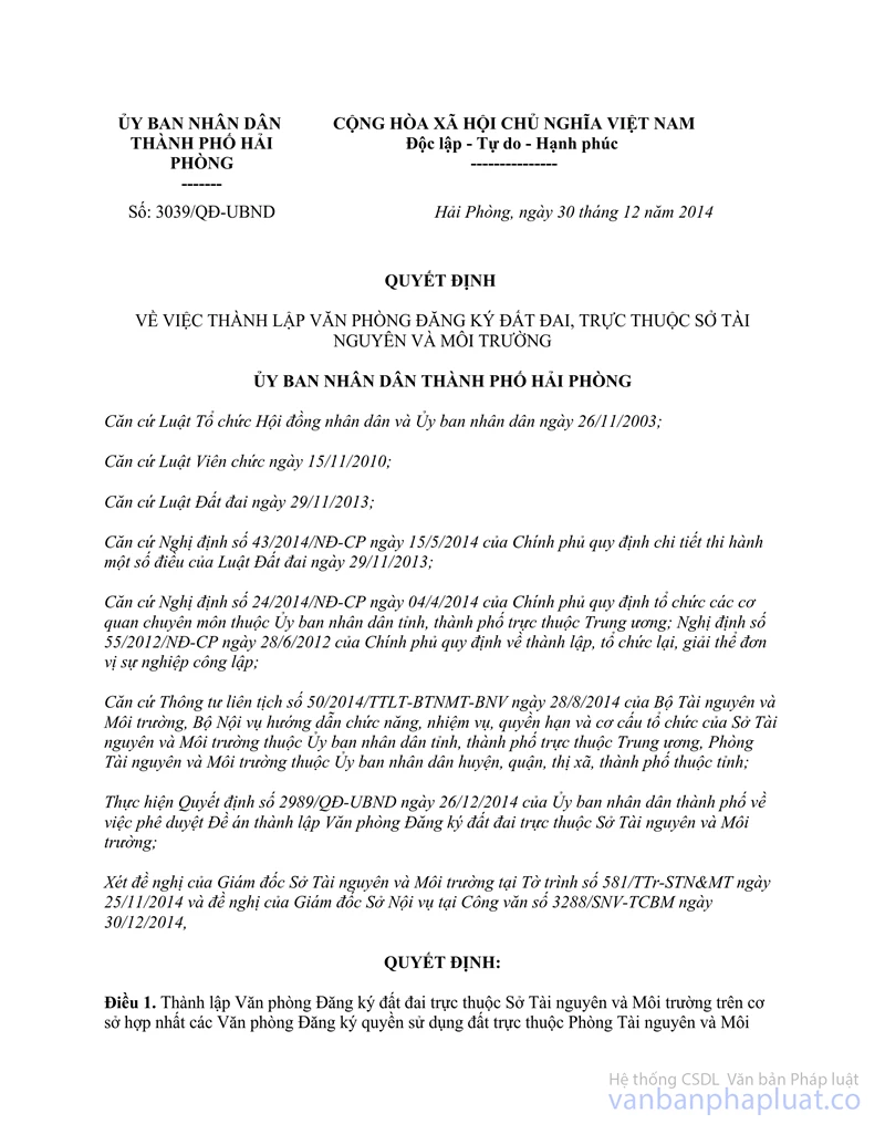 Căn cứ Thông tư liên tịch số 50/2014/TTLT-BTNMT-BNV ngày 28/8/2014 của Bộ Tài nguyên và Môi trường và Bộ Nội vụ hướng dẫn chức năng, nhiệm vụ, quyền hạn và cơ cấu tổ chức của Sở Tài nguyên và Môi trường thuộc Ủy ban nhân dân tỉnh, thành phố trực thuộc Trung ương, Phòng Tài nguyên và Môi trường thuộc Ủy ban nhân dân huyện, quận, thị xã, thành phố thuộc tỉnh;