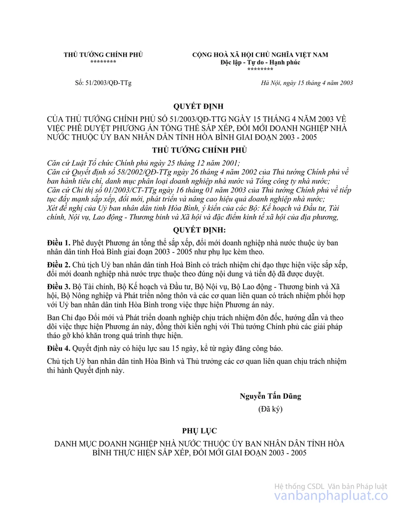1. Chỉ đạo thực hiện sắp xếp, đổi mới công ty nhà nước trực thuộc theo Quyết định số 51/QĐ-TTg ngày 15 tháng 4 năm 2003 của Thủ tướng Chính phủ về phê duyệt phương án tổng thể sắp xếp, đổi mới doanh nghiệp nhà nước trực thuộc Uỷ ban nhân dân tỉnh Hoà Bình giai đoạn 2003 - 2005 và Quyết định này.