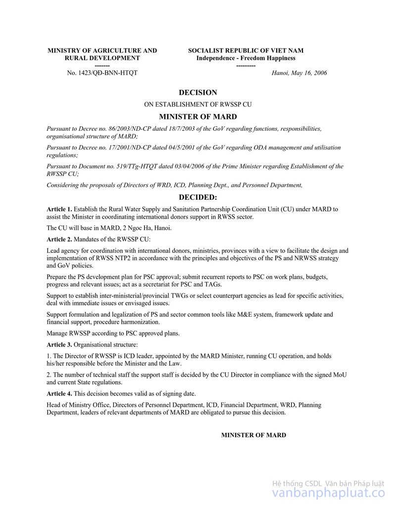 Căn cứ Văn bản số 519/TTg-QHQT ngày 03/04/2006 của Thủ tướng Chính phủ v/v thành lập Văn phòng Điều phối Quan hệ đối tác trong lĩnh vực cấp nước và vệ sinh nông thôn;