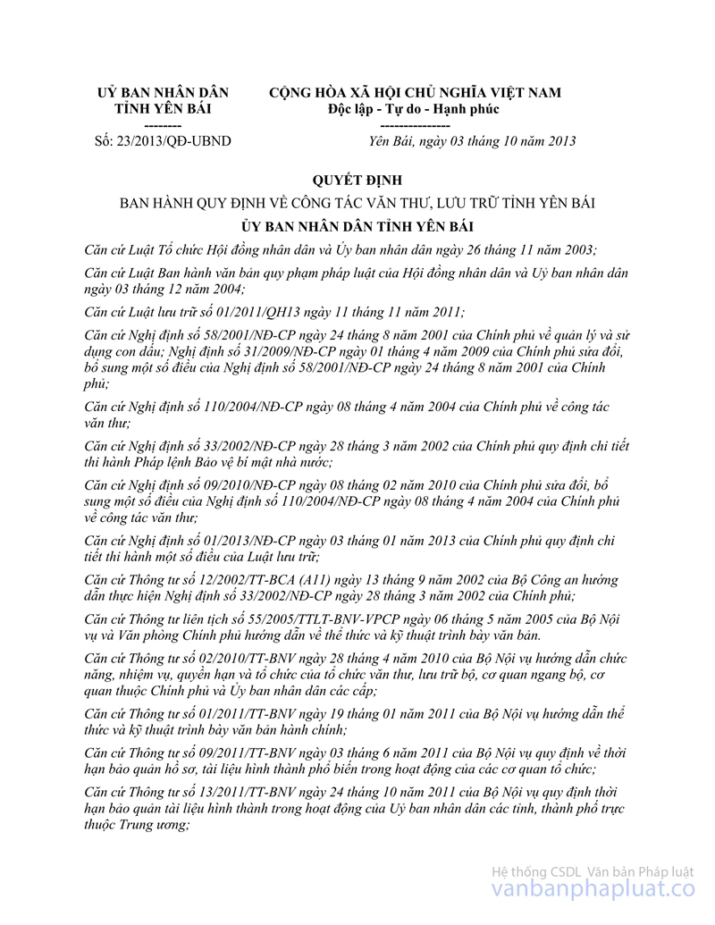 Căn cứ Quyết định số 23/2013/QĐ-UBND ngày 03/10/2013 của Ủy ban nhân dân tỉnh Yên Bái ban hành Quy định công tác văn thư, lưu trữ;