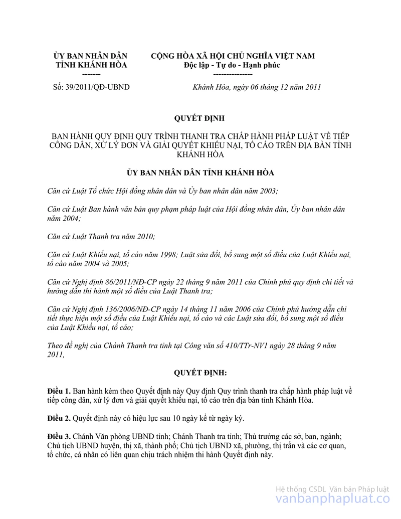 Điều 1. Bãi bỏ Quyết định số 37/2011/QĐ-UBND ngày 02 tháng 12 năm 2011 của Ủy ban nhân dân tỉnh về ban hành quy định quy trình thanh tra chấp hành pháp luật về phòng, chống tham nhũng trên địa bàn tỉnh Khánh Hòa, Quyết định số 39/2011/QĐ-UBND ngày 06 tháng 12 năm 2011 của Ủy ban nhân dân tỉnh về ban hành quy định quy trình thanh tra chấp hành pháp luật về tiếp công dân, xử lý đơn, giải quyết khiếu nại, tố cáo trên địa bàn tỉnh Khánh Hòa và Quyết định số 01/2012/QĐ-UBND ngày 10 tháng 01 năm 2012 của Ủy ban nhân dân tỉnh về ban hành Quy định trình tự, thủ tục tiếp công dân, xử lý đơn và giải quyết khiếu nại, tố cáo trên địa bàn tỉnh Khánh Hòa và hệ thống biểu mẫu.