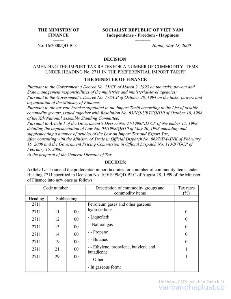 CỦA BỘ TRƯỞNG BỘ TÀI CHÍNH SỐ 16/2000/QĐ-BTC NGÀY 18 THÁNG 2 NĂM 2000 VỀ VIỆC SỬA ĐỔI MỨC THUẾ SUẤT THUẾ NHẬP KHẨU MỘT SỐ MẶT HÀNG THUỘC NHÓM 2711 TRONG BIỂU THUẾ THUẾ NHẬP KHẨU ƯU ĐÃI
