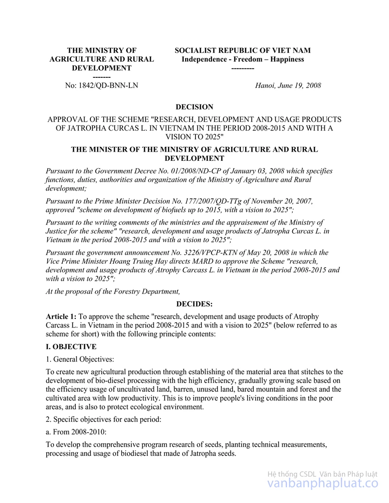Nội dung toàn văn Quyết định 1842/QĐ-BNN-LN phê duyệt Đề án “Nghiên cứu, phát triển và sử dụng sản phẩm cây Cọc rào (Jatropha curcas L.) ở Việt Nam giai đoạn 2008-2015