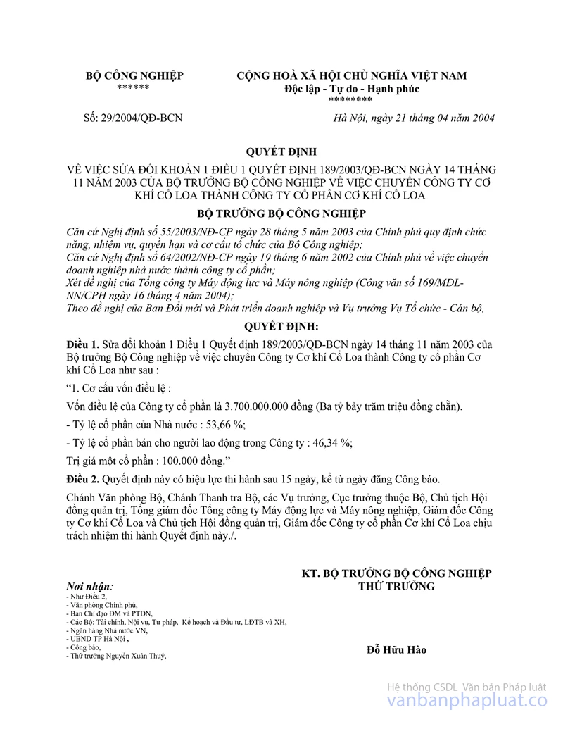 Nội dung toàn văn Quyết định 189/2003/QĐ-BCN chuyển Công ty Cơ khí Cổ Loa thành Công ty cổ phần Cơ khí Cổ Loa