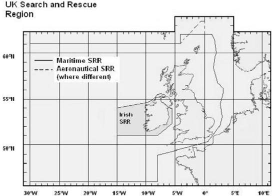 Toàn bộ vùng biển trách nhiệm TKCN của nước Anh rộng xấp xỉ 1,2 triệu km2 và được chia làm 3 khu vực tìm kiếm, cứu nạn (SRR) tương ứng với 19 Trung tâm TKCNHH khu vực. Các khu vực được phân thành: