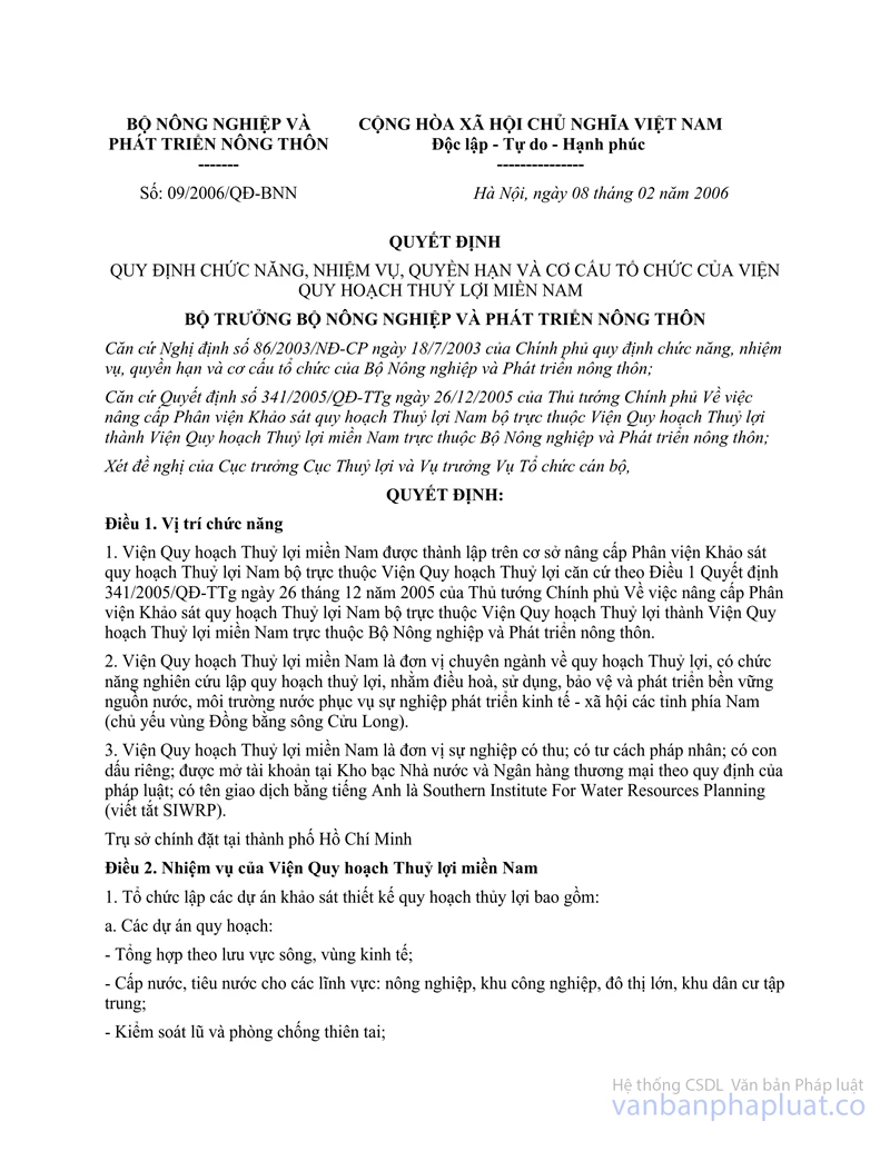 Nội dung toàn văn Quyết định 21/2006/QĐ-BNN chức năng, nhiệm vụ, quyền hạn cơ cấu tổ chức Viện quy hoạch thủy lợi miền nam sửa đổi 09/2006/QĐ-BNN