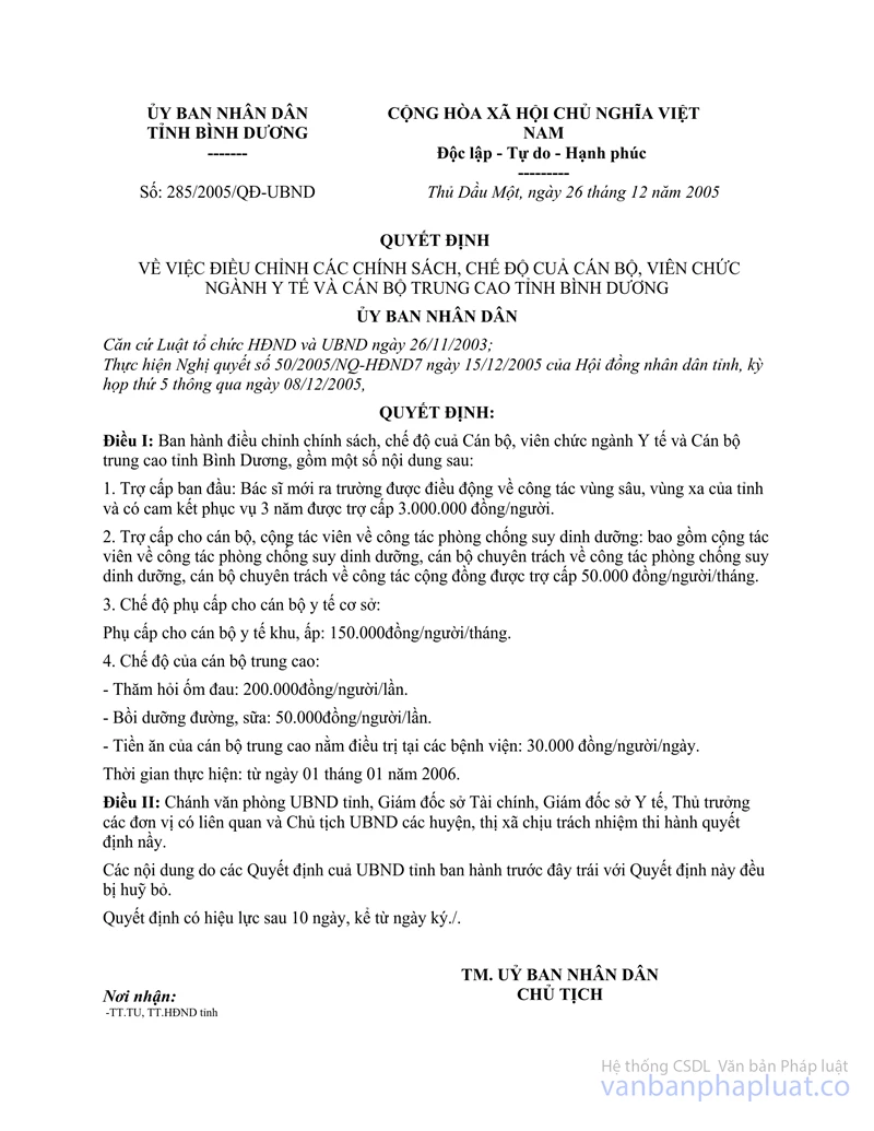 Quyết định số 285/2005/QĐ-UBND ngày 26/12/2005 của UBND tỉnh Bình Dương về việc điều chỉnh các chính sách, chế độ của cán bộ, viên chức Ngành Y tế và cán bộ trung cao của tỉnh. |