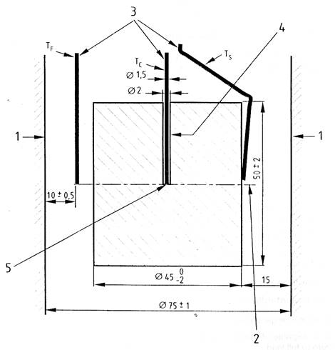 Cặp nhiệt điện này được định vị sao cho đầu nóng được đặt tại giữa tâm mẫu (xem hình 1 và 2). Để đạt được điều này, phần trên của mẫu thử tạo một lỗ dọc có đường kính 2 mm.
