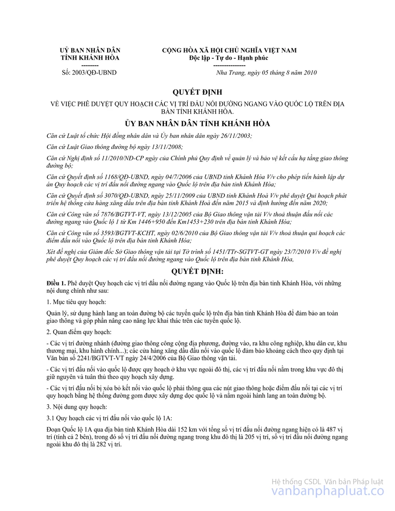 Căn cứ Quyết định số 2003/QĐ-UBND ngày 05/8/2010 của UBND tỉnh V/v phê duyệt quy hoạch các vị trí đấu nối đường ngang vào Quốc lộ trên địa bàn tỉnh Khánh Hòa.
