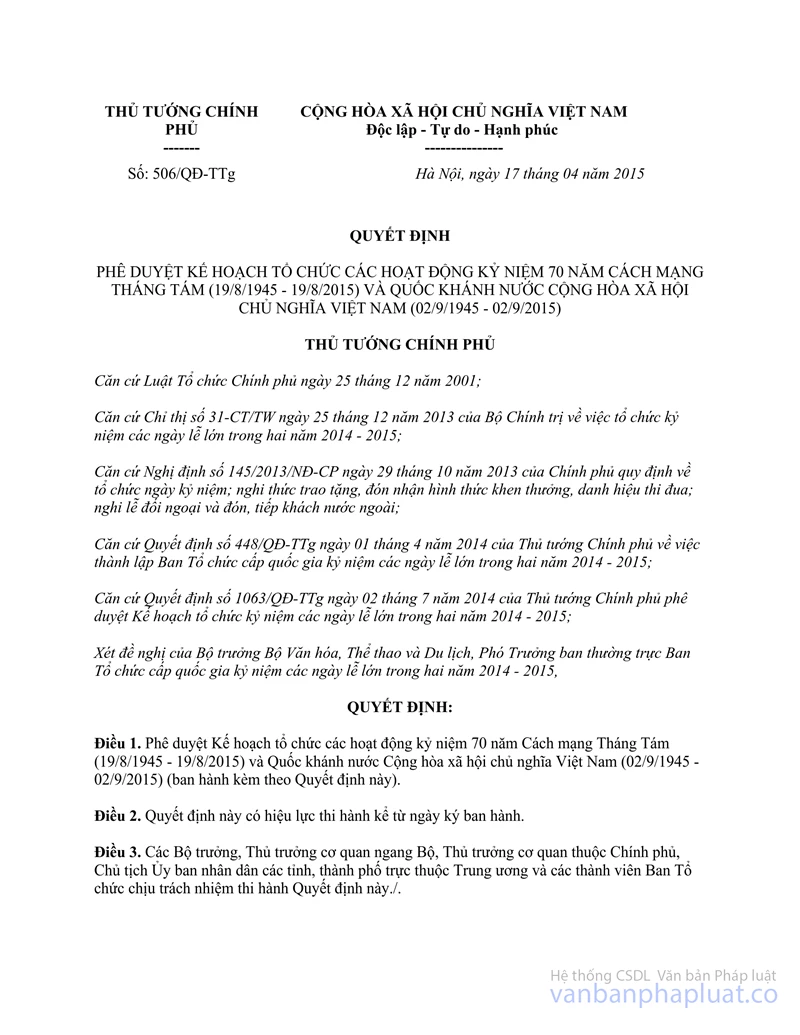 Căn cứ Quyết định số 506/QĐ-TTg ngày 17 tháng 4 năm 2015 của Thủ tướng Chính phủ phê duyệt Kế hoạch tổ chức kỷ niệm các hoạt động kỷ niệm 70 năm Ngày Cách mạng Tháng Tám (19/8/1945 - 19/8/2015) và Quốc khánh nước Cộng hòa xã hội chủ nghĩa Việt Nam (02/9/1945 - 02/9/2015);