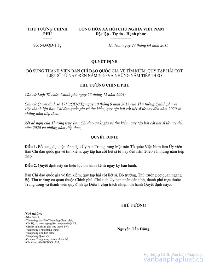 Căn cứ Quyết định số 543/QĐ-TTg ngày 24 tháng 4 năm 2015 của Thủ tướng Chính phủ về việc bổ sung thành viên Ban Chỉ đạo quốc gia về tìm kiếm, quy tập hài cốt liệt sĩ từ nay đến năm 2020 và những năm tiếp theo;