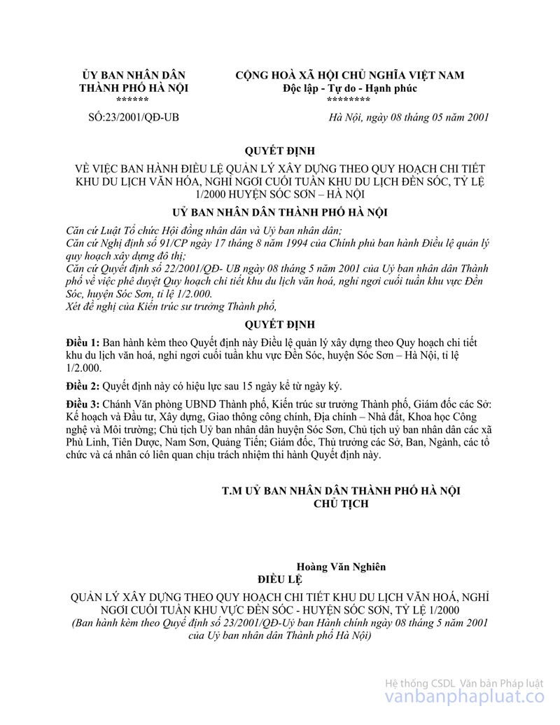 Nội dung toàn văn Quyết định số 22/2001/QĐ-UB phê duyệt quy hoạch Khu du lịch văn hoá nghỉ ngơi cuối tuần khu vực Đền Sóc, tỷ lệ 1/2000- Huyện Sóc Sơn Hà Nội