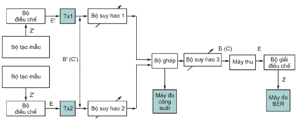 Bật máy phát Tx2. Điều chỉnh bộ suy hao 2 sao cho mức C/I tại điểm B(C) bằng với mức trong tiêu chuẩn, ghi lại giá trị BER theo C/I như trong tiêu chuẩn. Giá trị BER đo được phải nhỏ hơn hoặc bằng giới hạn trong tiêu chuẩn (điển hình là 10-5).