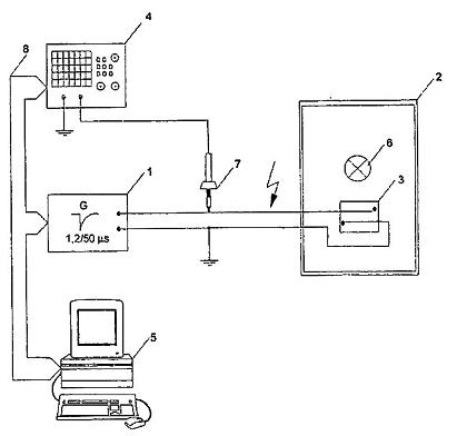 Mạch thử nghiệm biểu diễn trên Hình B.2. Điện áp thử nghiệm cực tính âm được cung cấp từ máy phát xung có dạng sóng điện áp 1,2/50 μs (xem IEC 61180-1) và trở kháng đầu ra nằm trong khoảng từ 50 Ω đến 500 Ω. Mẫu thử được đặt trong tủ khí hậu và độ ẩm tương đối đặt đến giá trị thích hợp. Mẫu thử được cấp năng lượng từ máy phát xung. Tán xạ thống kê của điện áp chịu xung có thể giảm do chiếu sáng UV, ví dụ được cấp từ đèn hơi thủy ngân. Không cần chiếu sáng UV nếu thực hiện liên tiếp từ 10 đến 20 thử nghiệm phóng điện bề mặt thích hợp trên cùng mẫu. Trong trường hợp này, tán xạ điện áp phóng điện bề mặt được phân tích và điện áp chịu đựng có giới hạn thấp hơn (giá trị 3σ). Điện áp thử nghiệm đặt vào có thể được đo sử dụng đầu đo điện áp cao và máy hiện sóng có nhớ kỹ thuật số.