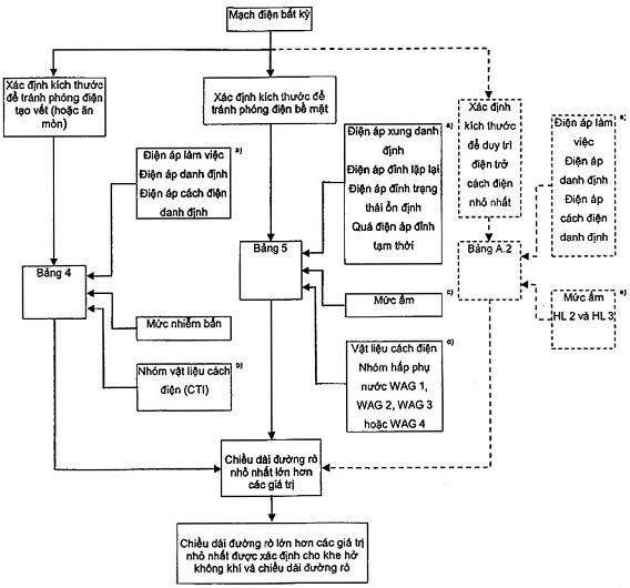 - chiều dài đường rò tối thiểu để tránh phóng điện bề mặt qua bề mặt cách điện (xem Bảng 5).