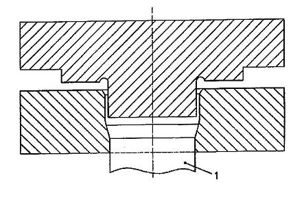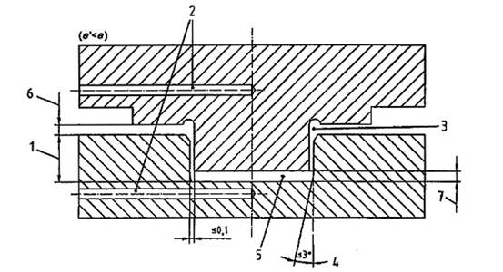 Góc có cạnh vát, nếu có, không được lớn hơn 3° (xem Hình 1). Khe hở giữa vách thẳng của ổ và vách của khuôn không được quá 0,1 mm (xem Hình 1). Kích thước e’ được tính sao cho không có rủi ro làm hư hại khuôn khi khuôn không có vật liệu.