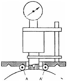 b) đế của dụng cụ đo được lắp hai thanh song song A và A’ cách nhau một khoảng tùy thuộc vào độ cong của bề mặt (xem Hình EH.1).