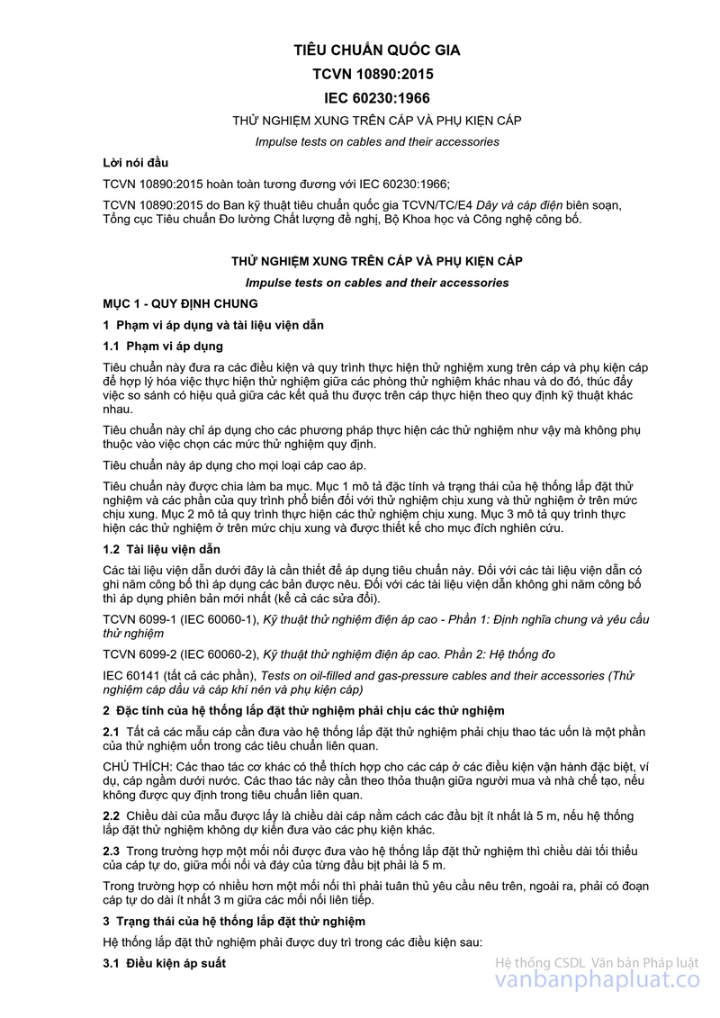 Tiêu chuẩn này quy định các phương pháp và yêu cầu thử nghiệm đối với hệ thống cáp điện lực, cáp rời và phụ kiện rời của cáp có điện áp danh định lớn hơn 30 kV (Um = 36 kV) đến và bằng 150 kV (Um = 170 kV) dùng cho hệ thống lắp đặt cố định.
