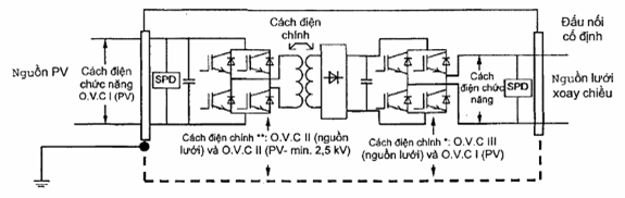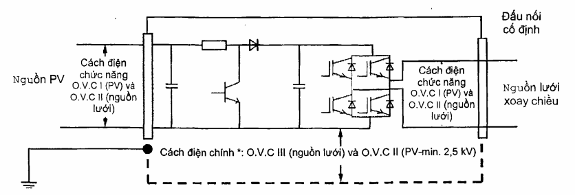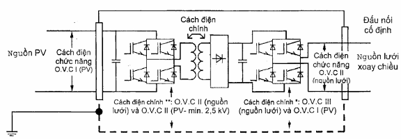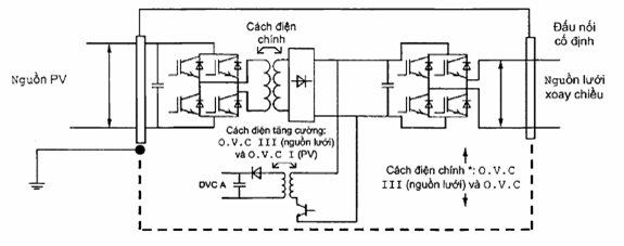Cách điện tăng cường: O.V.C III dựa trên điện áp hệ thống nguồn lưới và O.V.C I từ PV. (PV giảm một cấp O.V.C). Áp dụng mức khắc nghiệt nhất của những yêu cầu này.