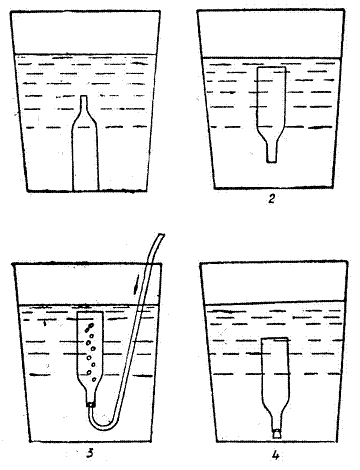 Trường hợp dùng chai (lọ) thủy tinh để chứa mẫu phải dùng vòng cao su chân không loại nhỏ đường kính trong 3mm hay ống nhựa mềm để đưa mẫu vào chai. Mẫu khí di chuyển trong ống phải được duy trì tránh không được lẫn không khí ở ngoài vào. Chai được dìm vào chậu nước ở vị trí thẳng đứng để đẩy hết không khí ở chai ra. Sau đó lật ngược chai lại để miệng chai hướng về phía đáy chậu nước (hình 1.1 và 1.2.). Sau đó mở từ từ mẫu khí ở nguồn khí vào ống dẫn khí với tốc độ 10 ÷ 15 giọt trong 3 đến 5 giây. Để như vậy khoảng 2÷3 phút để đuổi hết không khí trong ống dẫn ra ngoài; cho ống cao su vào miệng chai. Mẫu khí sẽ đẩy từ từ nước trong chai ra, đến khi thấy trong chai còn khoảng 5 cm nước (theo chiều cao của chai lập tức rút ống dẫn mẫu ra (hình 1.3). Đóng chai lại bằng nút cao su (hình 1.4) chằng chặt lại hoặc tráng miệng chai bằng parafin rắn: Bảo quản và vận chuyển chai chứa mẫu ở tư thế dốc miệng xuống phía dưới. Số nước còn lại trong chai có tác dụng làm lớp đệm ngăn cách mẫu với lớp không khí bên ngoài.