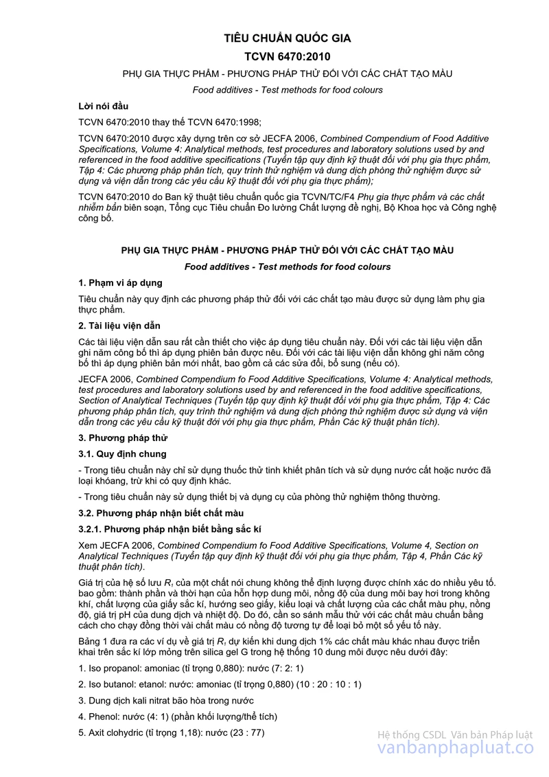 Tiêu chuẩn Việt Nam TCVN 6470:1998 (Phần IV JECFA - FAO FOOD and nutrition paper - 5 Rev. 2) về phụ gia thực phẩm - Phương pháp xác định cho phẩm màu thực phẩm do Bộ Khoa học Công nghệ và Môi trường ban hành đã được thay thế bởi Tiêu chuẩn quốc gia TCVN 6470:2010 về Phụ gia thực phẩm - Phương pháp thử đối với các chất tạo màu .