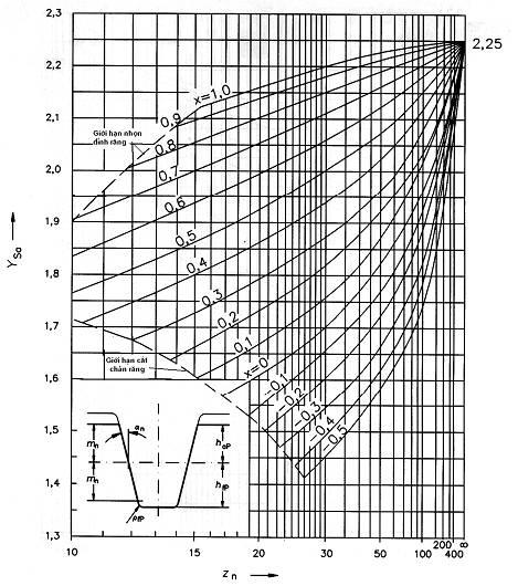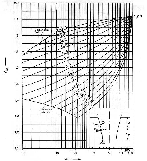 YFS: hệ số đỉnh răng, bằng (YFa YSa) (xem điều 5). Hệ số này tính đến tất cả ảnh hưởng do YFa và YSa. Hệ số YFS có thể được suy ra từ các đồ thị biểu thị các bánh răng thân khai ăn khớp ứng với bất kỳ thanh răng cơ sở thích hợp.