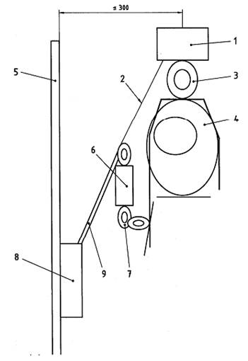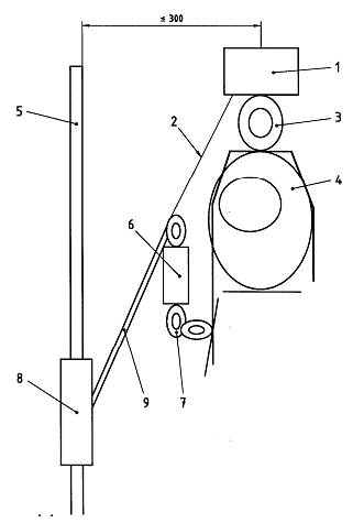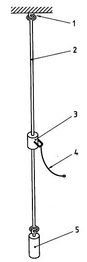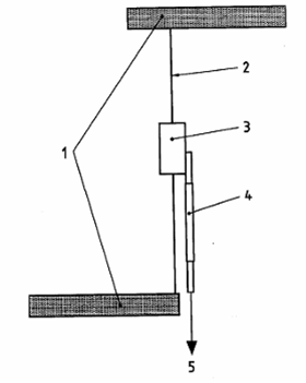 CHÚ THÍCH 1 Lực kế có thể được giữ bởi một dây nhỏ ở vị trí này trước khi thả mẫu thử. Dây này được buộc chặt vào đỉnh của lực kế và với bộ phận nối hoặc thiết bị khác giữ mẫu thử với dụng cụ thả nhanh, và được thả cùng một lúc với mẫu thử.