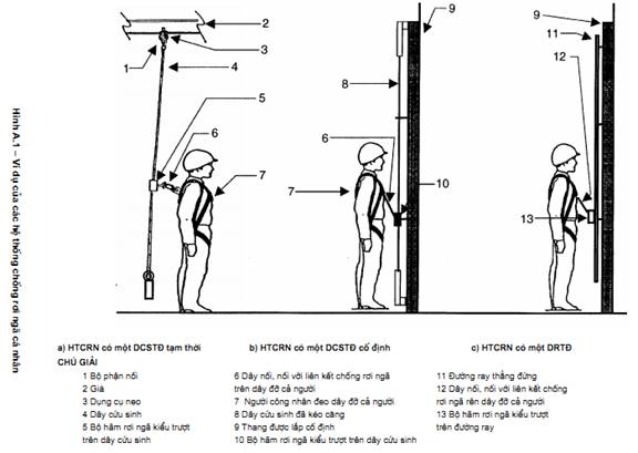 Chú thích 2 HTCRN sử dụng đường ray thẳng đứng và dây cứu sinh thẳng đứng cố định vốn đã hạn chế sự di chuyển theo phương nằm ngang của người sử dụng, trong khi đó HTCRN có sử dụng một dây cứu sinh thẳng đứng tạm thời cho phép người sử dụng di chuyển một cách đáng kể theo phương nằm ngang. Cần phải đưa ra ưu ý đặc biệt đối với các yêu cầu để phù hợp với sự khác biệt này.