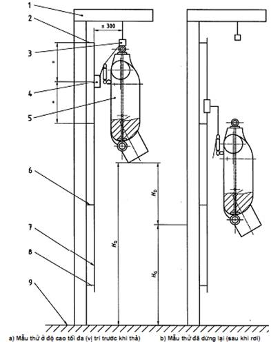CHÚ THÍCH 2 Lực kế phải được giữ ở vị trí trước khi thả nếu không thì chiều dài tự nhiên của nó có thể ảnh hưởng đáng kể đến việc rơi tự do của mẫu thử trong phép thử tính năng.