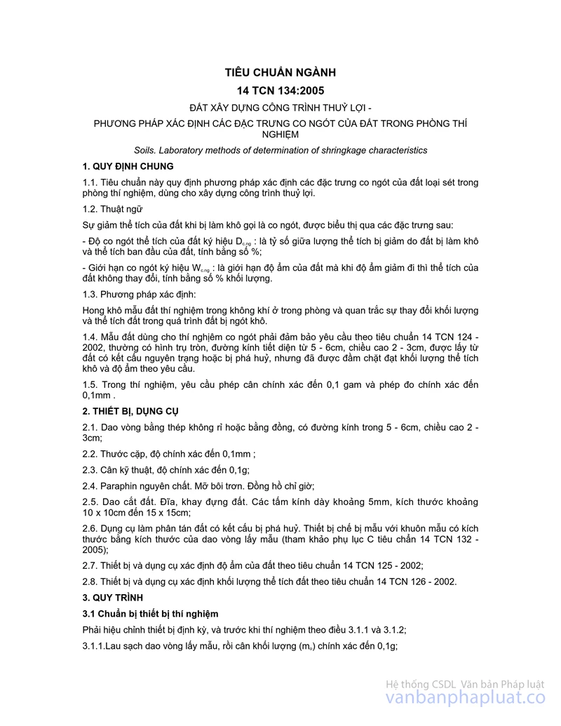 Tiêu chuẩn này áp dụng cho đất sét và đất bụi không chứa sạn sỏi, có kết cấu nguyên trạng hoặc bị phá hoại nhưng được đầm chặt lại với độ ẩm và khối lượng thể tích đơn vị đất khô theo yêu cầu, dùng cho xây dựng công trình thủy lợi.
