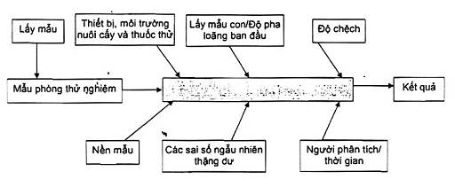 Trong Hình 1, việc lấy mẫu (lấy ra các đơn vị mẫu thử nghiệm từ lô được kiểm soát) nói lên một phần ý nghĩa (nếu không phải là chủ yếu) của sai số tổng nhưng không phải là phần không đảm bảo gắn liền với chính phép đo. Mẫu con có nghĩa là phần mẫu thử lấy ra từ mẫu phân tích (một trong những đơn vị lấy ra từ lô). Phần mẫu thử này được dùng để chuẩn bị dung dịch huyền phù ban đầu các kỹ thuật định lượng vi khuẩn theo TCVN 6507-1 (ISO 6887-1). Các nguồn chính của độ không đảm bảo trong quá trình phân tích là người phân tích/thời gian và thiết bị/môi trường nuôi cấy/thuốc thử. Cuối cùng, các sai số ngẫu nhiên hệ thống thặng dư là cái không được giải thích bởi các yếu tố trước và thường được đánh giá trong phòng thử nghiệm trong các điều kiện lặp lại.