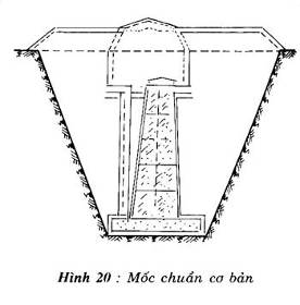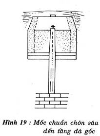 b) Mốc sâu này được chôn vào các hố khoan ở các phần khác nhau của hố móng trước khi đào, thấp hơn so với độ cao của đáy móng từ 0.5 -0.8 m. Đầu tiên ta đổ vào hố khoan đó một lượng nhỏ bê tông và sẽ ấn vào đó một dấu mốc. Cũng như cách thứ nhất, độ cao được chuyển từ mốc thuỷ chuẩn gần nhất bằng cách đo thuỷ chuẩn chính xác lên đầu một thanh có độ dài đã biết, thanh này đặt lên đầu mốc nằm trong hố khoan. Hoặc là bằng cách đọc số trên một thước cuộn có quả nặng một đầu thả vào trong hố khoan tiếp xúc với mặt mốc còn đầu kia vắt lên quả ròng rọc.