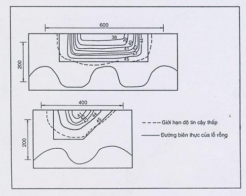 Phương pháp dò tìm và phác họa lỗ rỗng đã được kiểm chứng bằng cách đo V cho một số mẫu bê tông được tạo trước các lỗ rỗng có kích thước khác nhau. Lưới đo có kích thước là 50mm. Kết quả đo được thể hiện trên hình C.2 phụ lục C. Hình này cho thấy vận tốc xung giảm nhanh về phía tâm lỗ rỗng vì các đường đồng mức vận tốc chụm lại với nhau, vận tốc xung ở bên trong lỗ rỗng thấp hơn giá trị vận tốc xung trung bình nhiều. Và đường giới hạn độ tin cậy thấp bám rất sát với biên của lỗ rỗng.