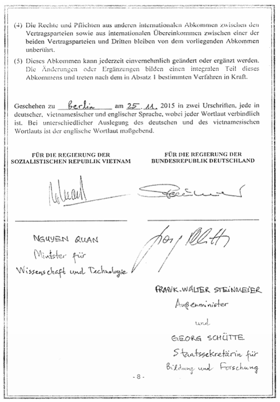 Done at Berlin on 25 November 2015 in duplicate in the German, Vietnamese and English languages, all three texts being authentic. In case of divergent interpretations of the German and Vietnamese texts, the English text shall prevail.