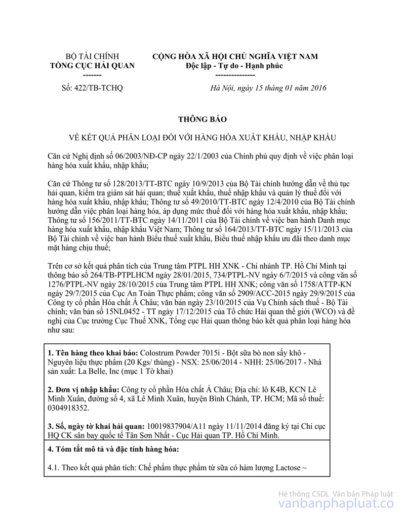 Thông báo 3092/TB-TCHQ 2015 phân loại hàng hóa xuất nhập khẩu là Bột sữa bò non sấy khô đã được thay thế bởi Thông báo 422/TB-TCHQ kết quả phân loại bột sữa bò non sấy khô xuất nhập khẩu 2016 và được áp dụng kể từ ngày 15/01/2016.