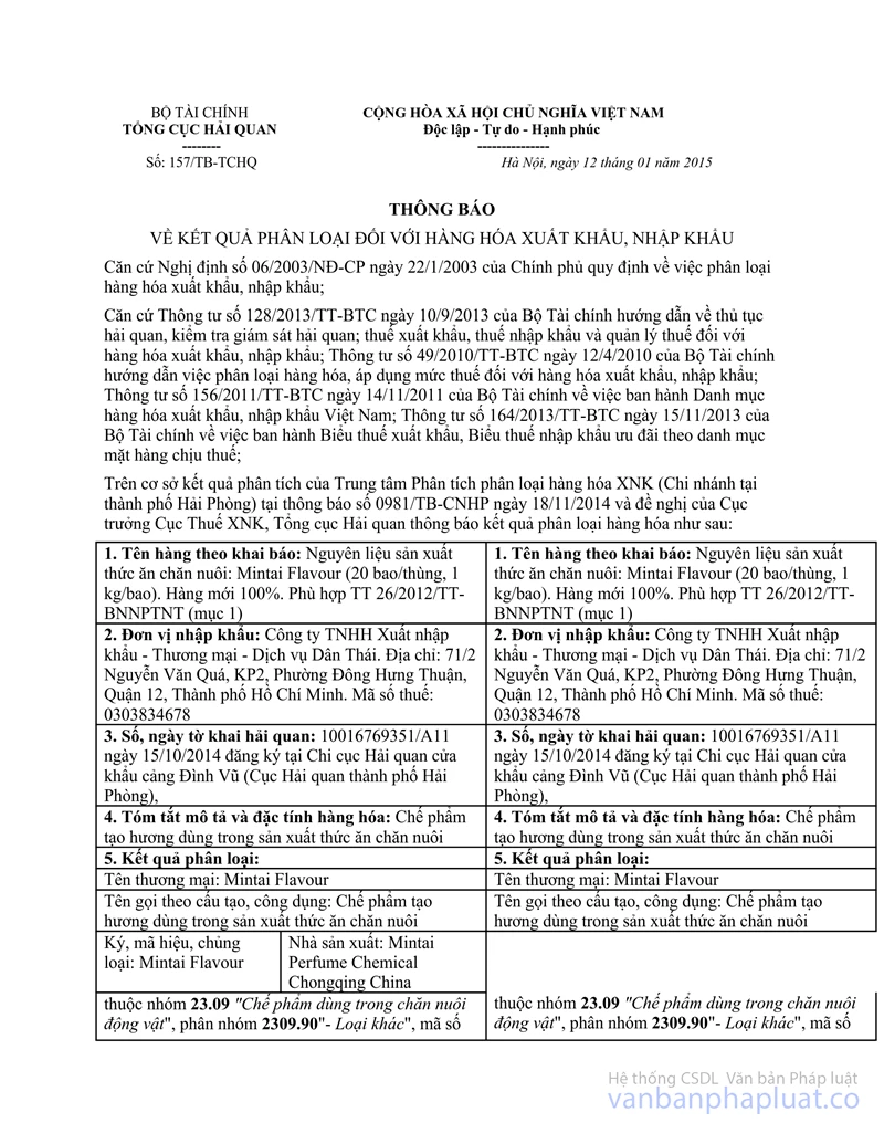 Nội dung toàn văn Thông báo 3333/TB-TCHQ 2015 kết quả phân loại đối với hàng hóa xuất nhập khẩu