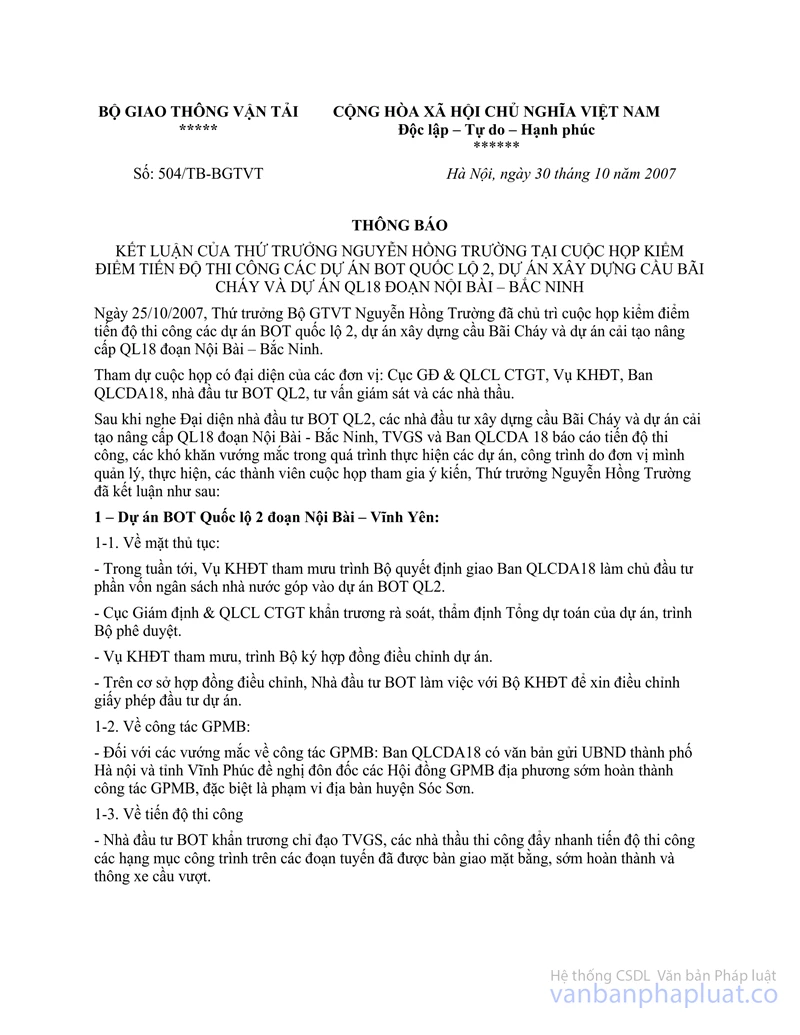Ngày 14/11/2007, Bộ GTVT đã có cuộc kiểm tra thực tế tình hình thi công tại Gói thầu 1A (Mở rộng đoạn Nội Bài - Bắc Ninh từ 2 làn xe lên 4 làn xe). Qua kiểm tra hiện trường cho thấy: về cơ bản không còn vướng mắc về mặt bằng nhưng các Nhà thầu vẫn chưa tập trung lực lượng thi công; có nhiều đoạn thi công cầm chừng, nhiều đoạn không thấy triển khai thi công mặc dù tiến độ yêu cầu hoàn thành Dự án còn rất ít, Bộ GTVT cũng đã nhiều lần kiểm tra, đôn đốc và giải quyết tháo gỡ các tồn tại vướng mắc nhằm đẩy nhanh tiến độ (Thông báo số 317/TB-BGTVT ngày 18/7/2007, Thông báo số 469/TB-BGTVT ngày 09/10/2007, Thông báo số 504/TB-BGTVT ngày 30/10/2007 và các Văn bản khác).