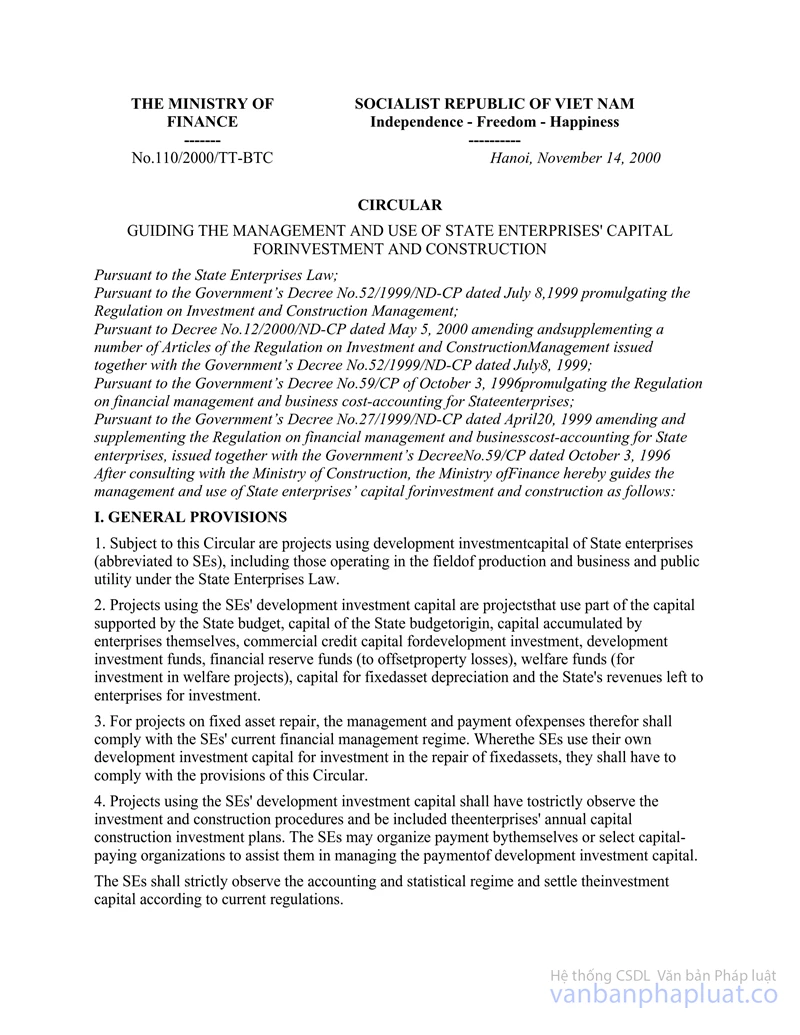 CỦA BỘ TÀI CHÍNH SỐ 110/2000/TT-BTC NGÀY 14 THÁNG 11 NĂM 2000 HƯỚNG DẪN QUẢN LÝ VÀ SỬ DỤNG VỐN CỦA DOANH NGHIỆP NHÀ NƯỚC DÀNH CHO ĐẦU TƯ VÀ XÂY DỰNG