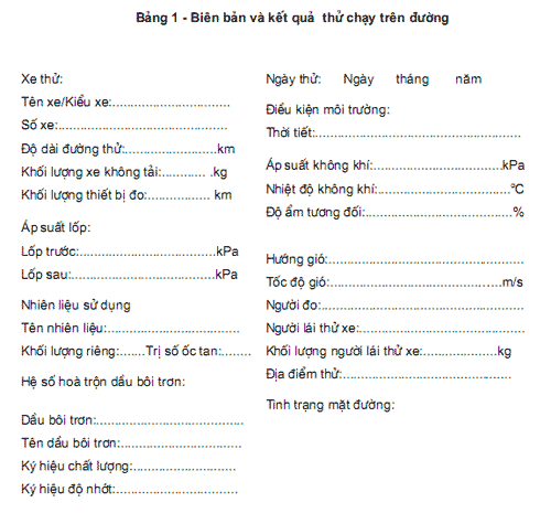 - Thiết bị đo mức tiêu hao nhiên liệu: Lượng nhiên liệu đủ chạy cho cả quãng đường thử, đồng hồ có thể đo được 0,01 lít. Tuy nhiên, nếu không trang bị được thiết bị này thì có thể dùng bình nhiên liệu của xe và thiết bị đo khác để đo lượng tiêu hao nhiên liệu.